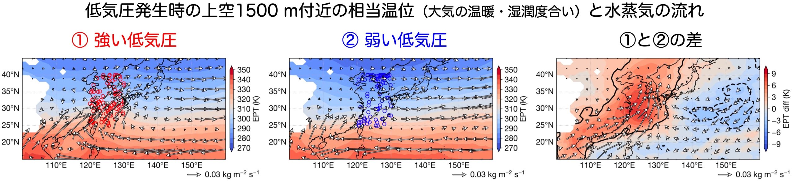 これまで多くの研究では、低気圧が急発達するときの低気圧の構造や周囲の大気・海洋の状況(環境場)が調べられてきました。一方で、低気圧が発生した直後の環境場は十分に理解されていませんでした。そこで本研究では、過去20年間に日本の西方で発生した低気圧を対象に、低気圧の発生直後の環境場と、その後の強さとの関係を統計的に調べました。